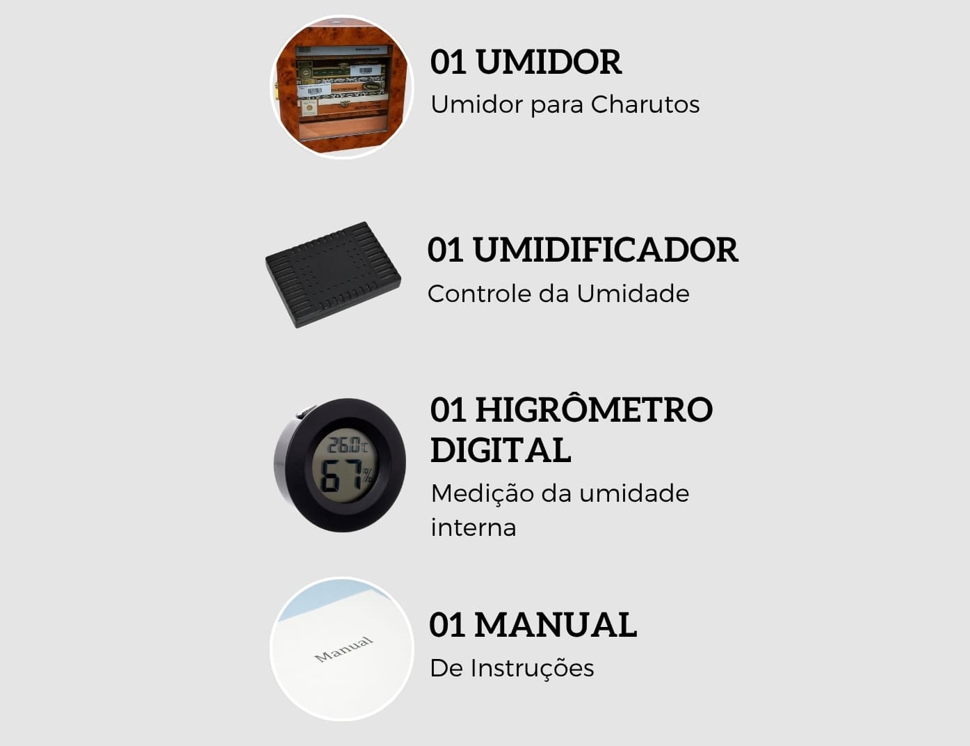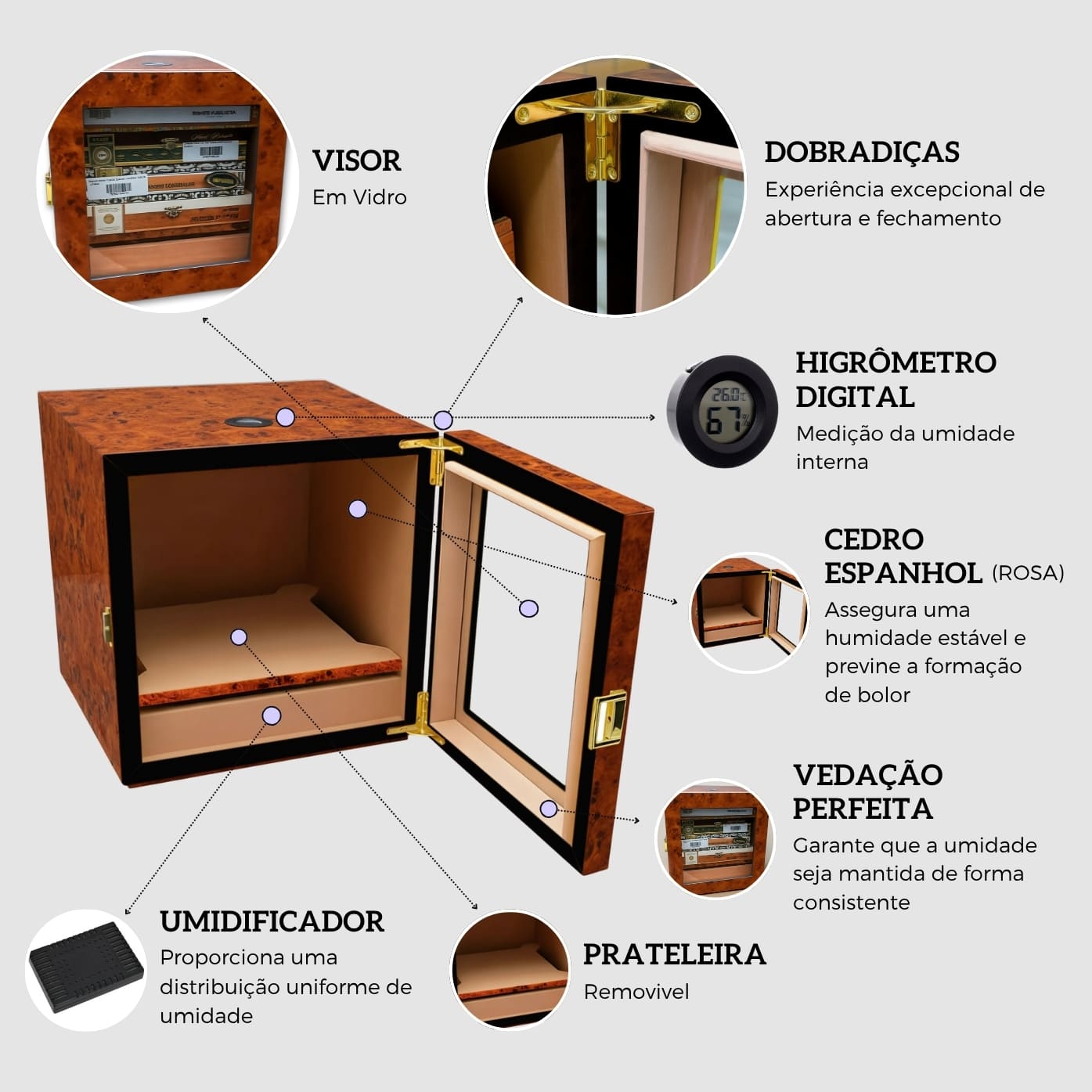 - Fabricado nacionalmente: Qualidade e Segurança proporcionados por quem está a mais de 20 anos no mercado especializados em fabricação de Umidores para Charutos atendendo as principais Tabacarias do Brasil.