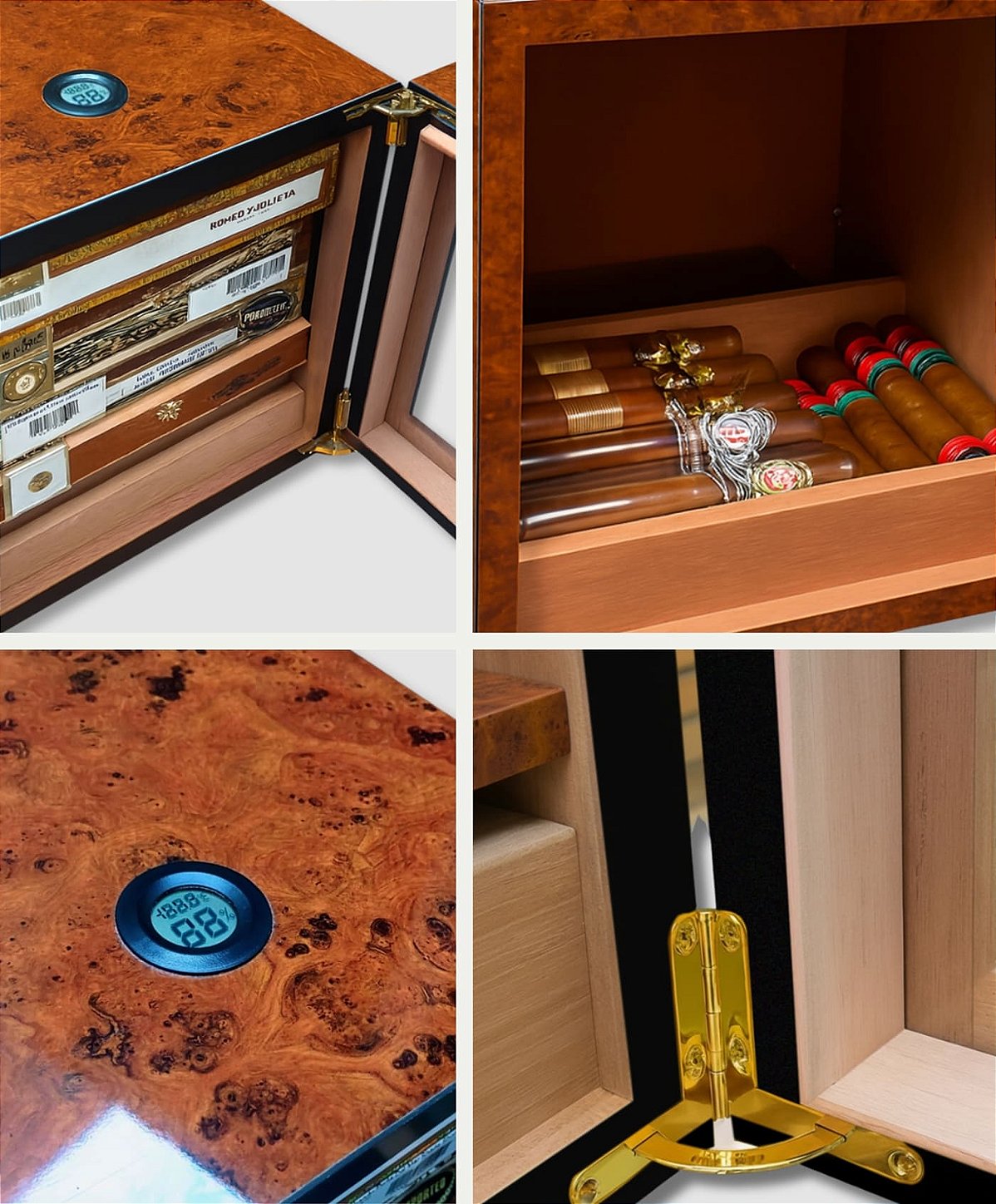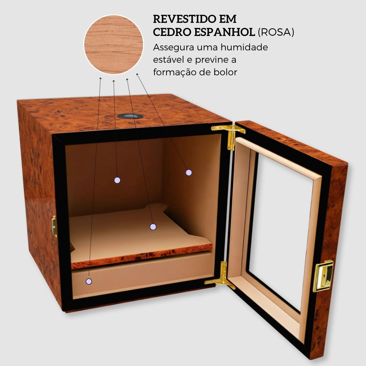 - Cedro espanhol (Alta capacidade de absorção de humidade, assegurando um clima estável seja mantido no interior do humidor e se previna a formação de bolor)
